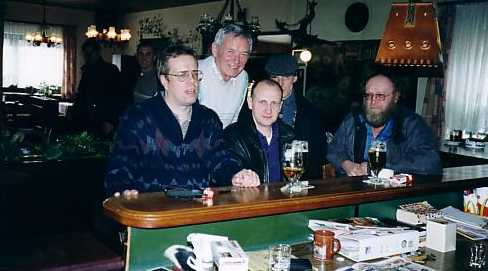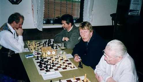 GMBZ Herbert Schulz ist sich nicht zu schade, seine filigranen Techniken im Stellungverbauen und Angriffsentsetzen interessierten Schachkollegen weiterzugeben. Sein Wahlspruch: "Ich mache aus meiner jahrzehntelangen Erfahrung keinen Hehl!" Auf dem Photo die freiwillige Nachhilfegruppe des SV Reichenbach (29. Februar 2001) beim frühmorgentlichen Eingangszeremoniell der ganztätigen Kurse, die nicht selten bis in die späten Abendstunden dauern, falls die Kursteilnehmer nicht schon vorher den profunden Kenntnissen des GMBZ zu erliegen kommen. |