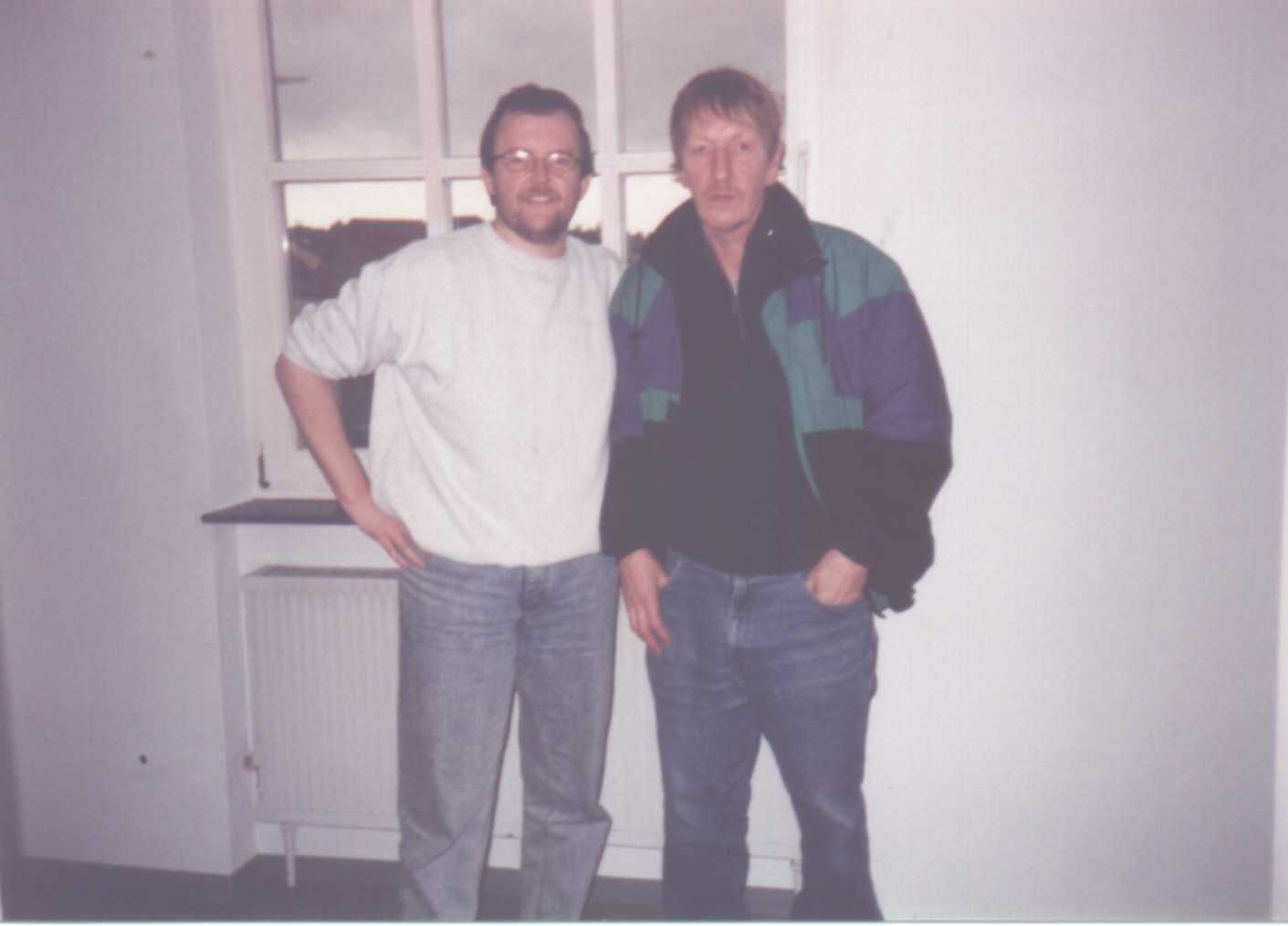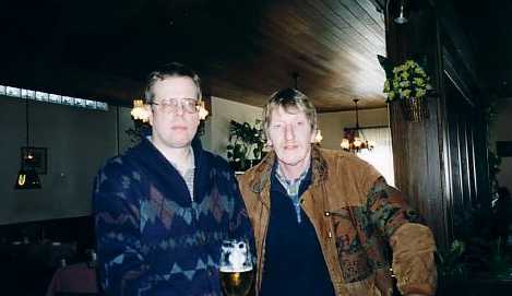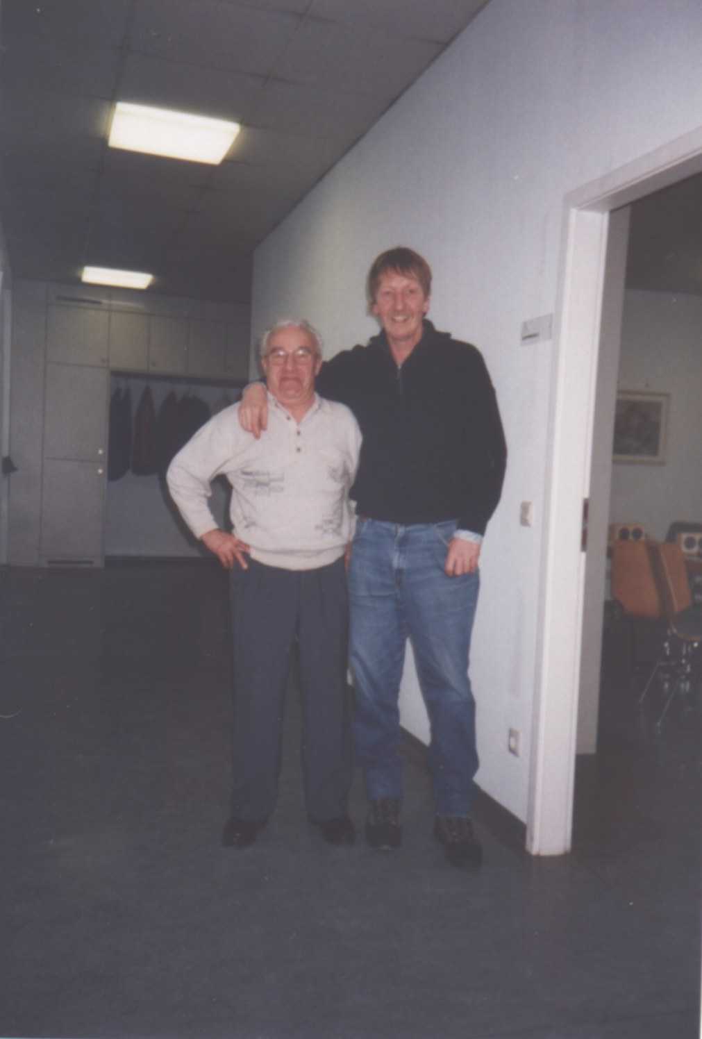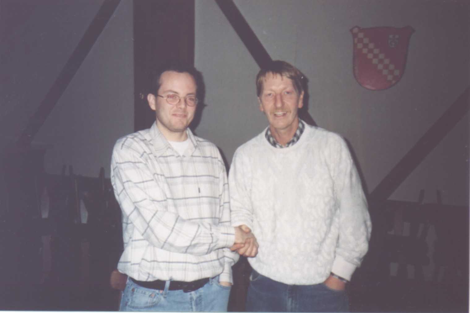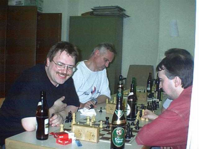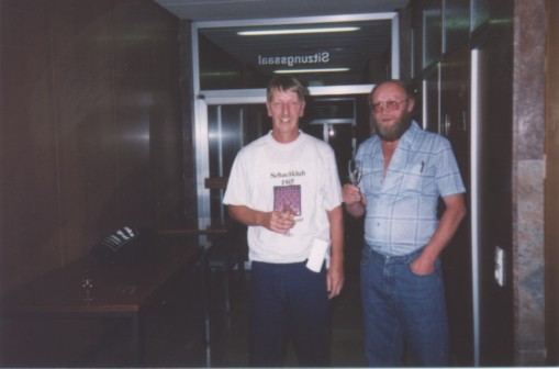 Auf diesem Bild sehen Sie die beiden Initiatoren der im Kreis Bergstraße im Frühjahr 2001 durchgeführten Aktion: "Bierselige Schachwelt". Links Schulzbezwinger Stephan Ziska (SV Reichenbach), rechts GMBZ Herbert Schulz (SK Fürth). |