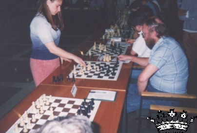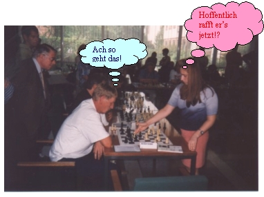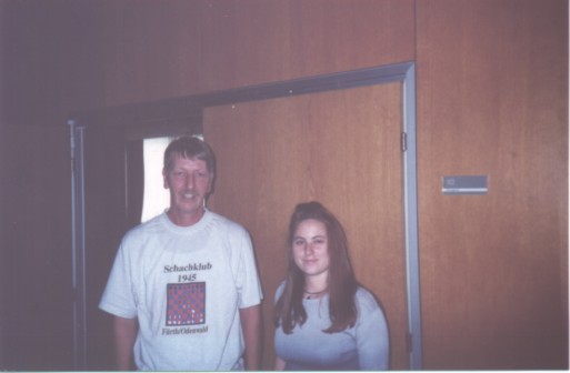 Und hier das Photo mit absolutem Seltenheitswert: Walter Schuchmann (SV Reichenbach) ertrotzt bei einem Simultanturnier mit der sympathischen Schachweltmeisterin Judith Polgar ein ½ zu ½. (Die Krone hatte er sich schon vorher mitgebracht). |