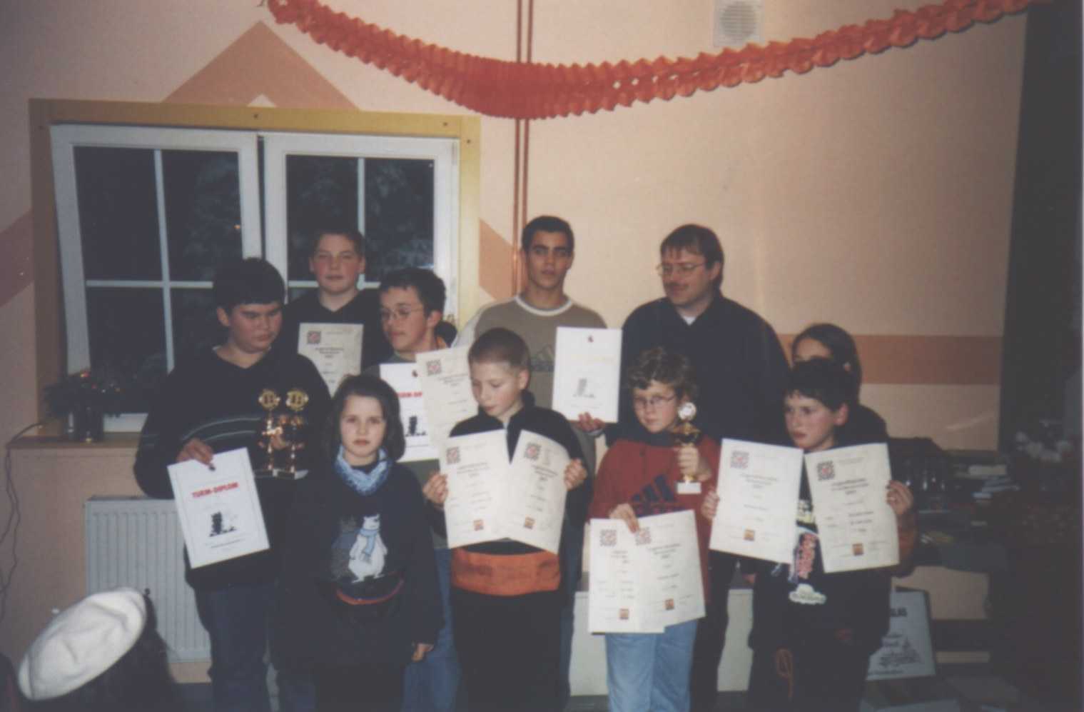 Jugendehrung bei der Weihnachtsfeier 2001 des SK Fürth. Hinten (von l. nach r.): Sean Fischer, Daniel Keil, Lukas Lammer, Jonas Schmitt, 1. Vorsitzender Ralf Mattusch, Katharina Schütz (leider verdeckt); Vorne: Lena, Jan Fendrich, Christian Giebel, Benedikt Giebel |