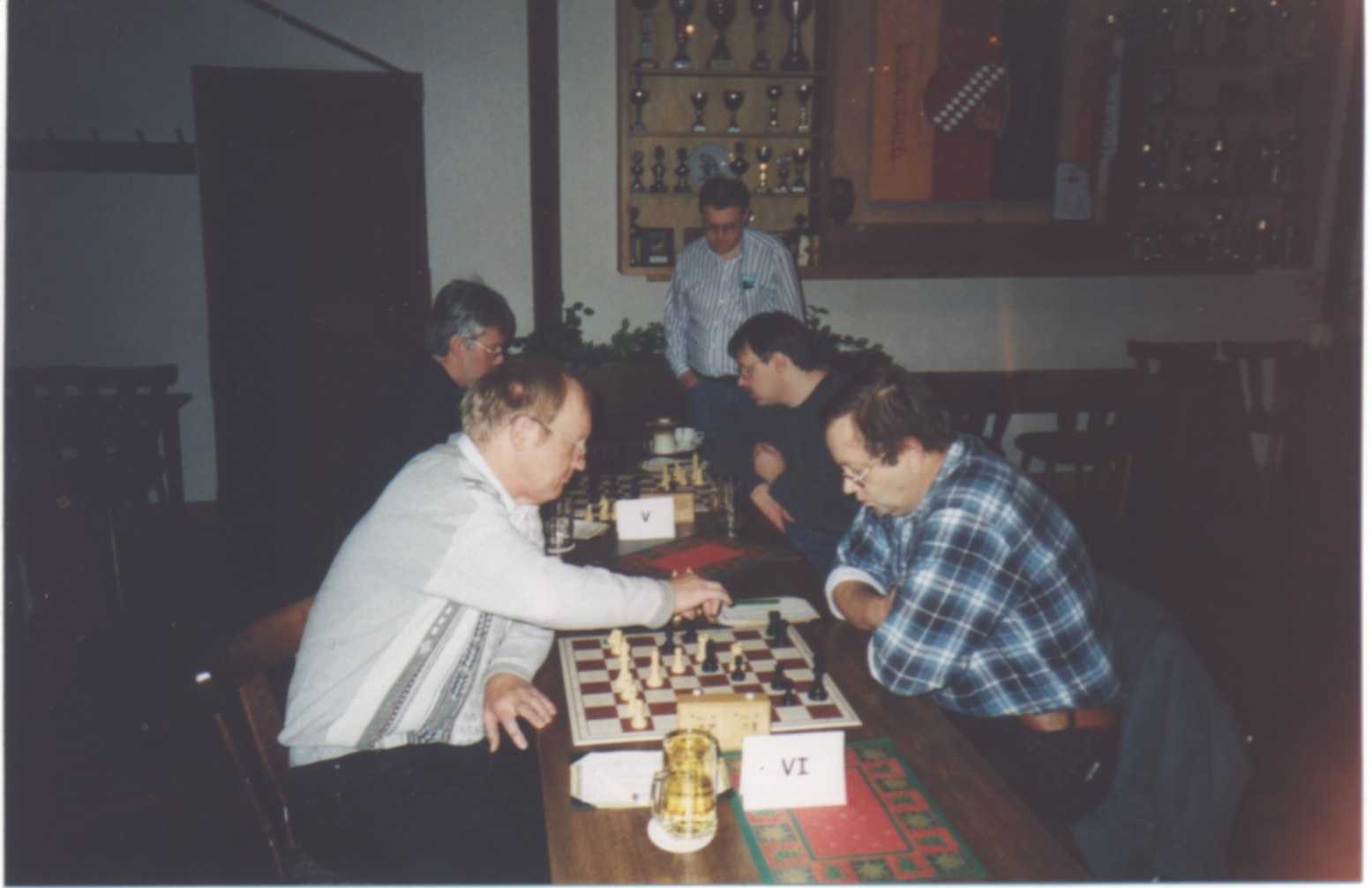 Auf der rechten Seite drei Spieler der in die Jahre gekommenen Nachwuchsmannschaft des SK Fürth beim versonnenen Spiel. Nur ein kurzer Blick auf das Schachbrett von GMBZ Herbert Schulz (Mitte, weiße Figuren) verdeutlicht die spannungsreiche Dynamik des Zentrumspieles der virtuos hingezauberten Mittelspielstellung. |