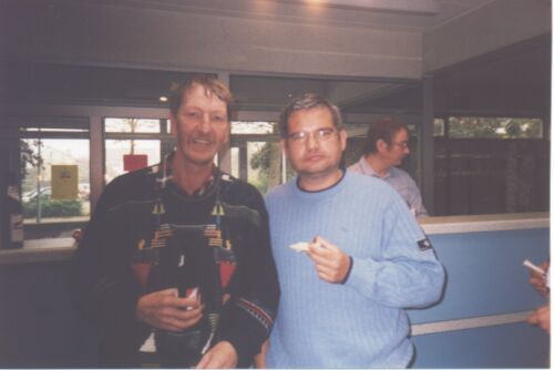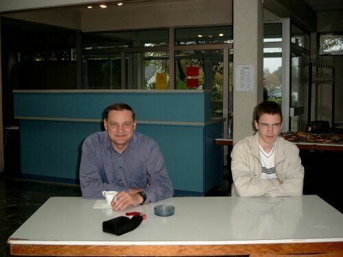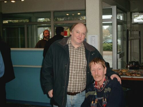 Homepagebetreiber unter sich: väterlich-tröstlich legt der Neueinsteiger Hodegi seine Hand auf die Schulter von GMBZ Herbert Schulz. Hatte er es doch glatt geschafft, wenigstens am 29. September 2002 den Gästebuch-Tageshighscore des Großmeisterbezwingers einmalig zu durchbrechen. Dennoch steht dem GMBZ die Trauer mit aufgezwungenem Lächeln ins Gesicht geschrieben. |