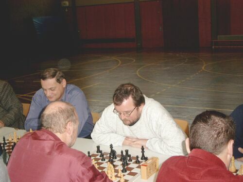 Duell der Giganten (SV Biblis - Fürth II): "Geht dassdannaa?" rbbib (SV Biblis), der mit Blickfixierung den Angriff seines Gegners zu bannen hofft, während Mannschaftskollege Gunther Benndorf verschmitzt das Geschehen auf dem Brett verfolgt. |