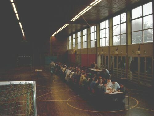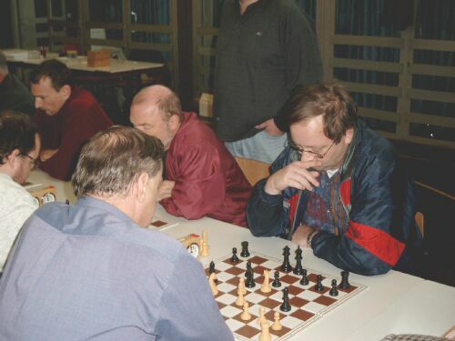 Duell der Giganten (andere Seite): "Kein Schnupftabak und dann noch so ne besch... Stellung!" Hardie (SK Fürth II) im Status der Ratlosigkeit, wodurch sich auch die Verschmitztheit seines Gegners Gunther Benndorf (s. 1. Bild) erklärt. |