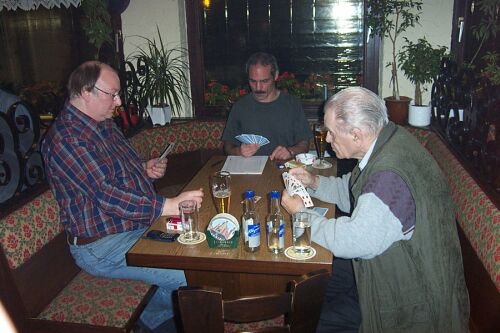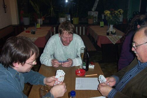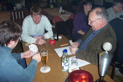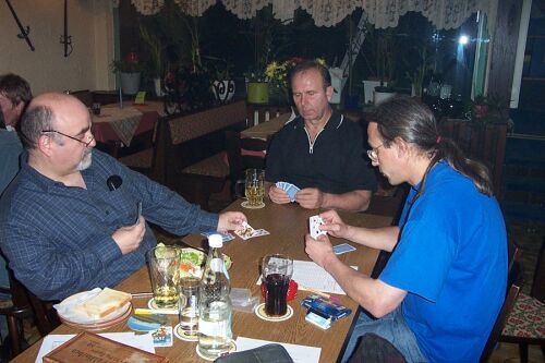 Skatwanderpokal Fürth 2002: Esters Motto: "Vitaminreiche Kost steigert das geistige Vermögen!", deshalb erst einmal einen Mega-Salat eingeschmissen. -------------------------------------------- Doch zur Absicherung der skattaktischen Finessen kann auch ein interessierter Blick in des Gegners Karten nicht schaden: |