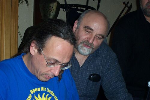 Skatwanderpokal Fürth 2002: Hektische Betriebsamkeit bei den Turnierleitern (Nudel und Hardie), wenn es um die Aufstellung der nächsten Runde geht. Deutlich ist Ester (links) die Erleichterung anzumerken, dass er nicht in der Gruppe des GMBZ (genannt auch die Krake) gelandet ist. |
