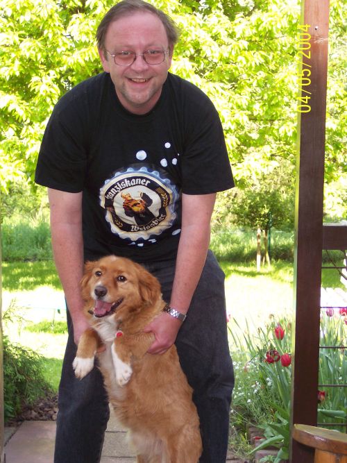 "Erste Schritte in ein geregeltes Leben! Hardie im Laiennovizenhabit - eine Zeit, in der die geistig-spirituellen Qualitäten auf vielfältigste Art geprüft werden. Hier mit Klosterpfortenwächter Benni.