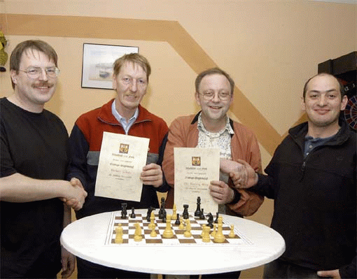 Die beiden SK-Fürth-Senioren - der GMBZ (40 Jahre Mitglied) und Hardie (25 Jahre) - bekamen extra eine Urkunde von dem 1. Vorsitzenden Ralf Mattusch (links) und dem 2. Vorsitzenden Murmeli Bülbül (rechts) überreicht, weil sie auf geniale Weise ein diffiziles Hodegi-Schachrätsel gelöst hatten. |