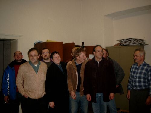 Man sollte es kaum glauben: dies war das einzig halbwegs anständige Gruppenphoto, das man zum Abschluss des Vereinsblitzturnieres 2002 in Fürth hinbekommen hat. Links außen der Blitzmeister (Muammer Bülbül), in der Mitte der Vize (Eric Pade) und der Rest auf der rechten Seite benimmt sich wie eine Horde Ostfriesen, die alle auf den vordersten Platz im Bus drängeln wollen. |