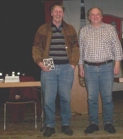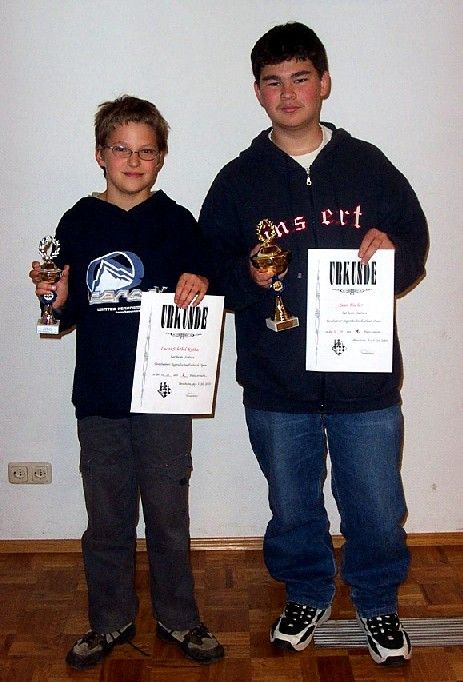 Lucas Schöbel-Kröhn junior (3. Platz U12 - mit 10 Jahren!!!) und Sean Fischer (1. Platz in U18) kamen zum Bensheimer Jugend-Open, sahen, spielten und siegten. Was sie nun in die Pokale schütten sollen, wissen sie auch nicht, weil der Papa Biere konkurrierenden Homepage-Webmastern verspricht. Es braucht natürlich nicht extra erwähnt werden, dass beide der disziplinierten Fürther Schachschule entsprossen sind. |