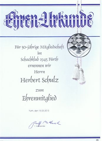 aufgrund besonderer Verdienste für den Schachklub 1945 Fürth im Laufe